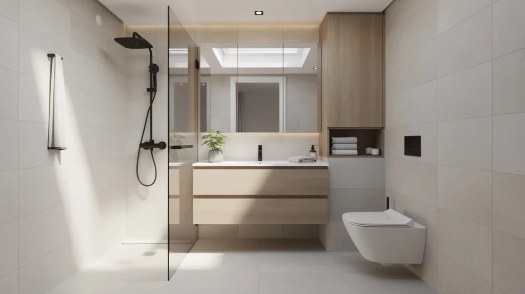 - Gamme intermédiaire : 8 000 à 11 000 € – matériaux de qualité supérieure, douche à l’italienne, rangements optimisés, finitions soignées.